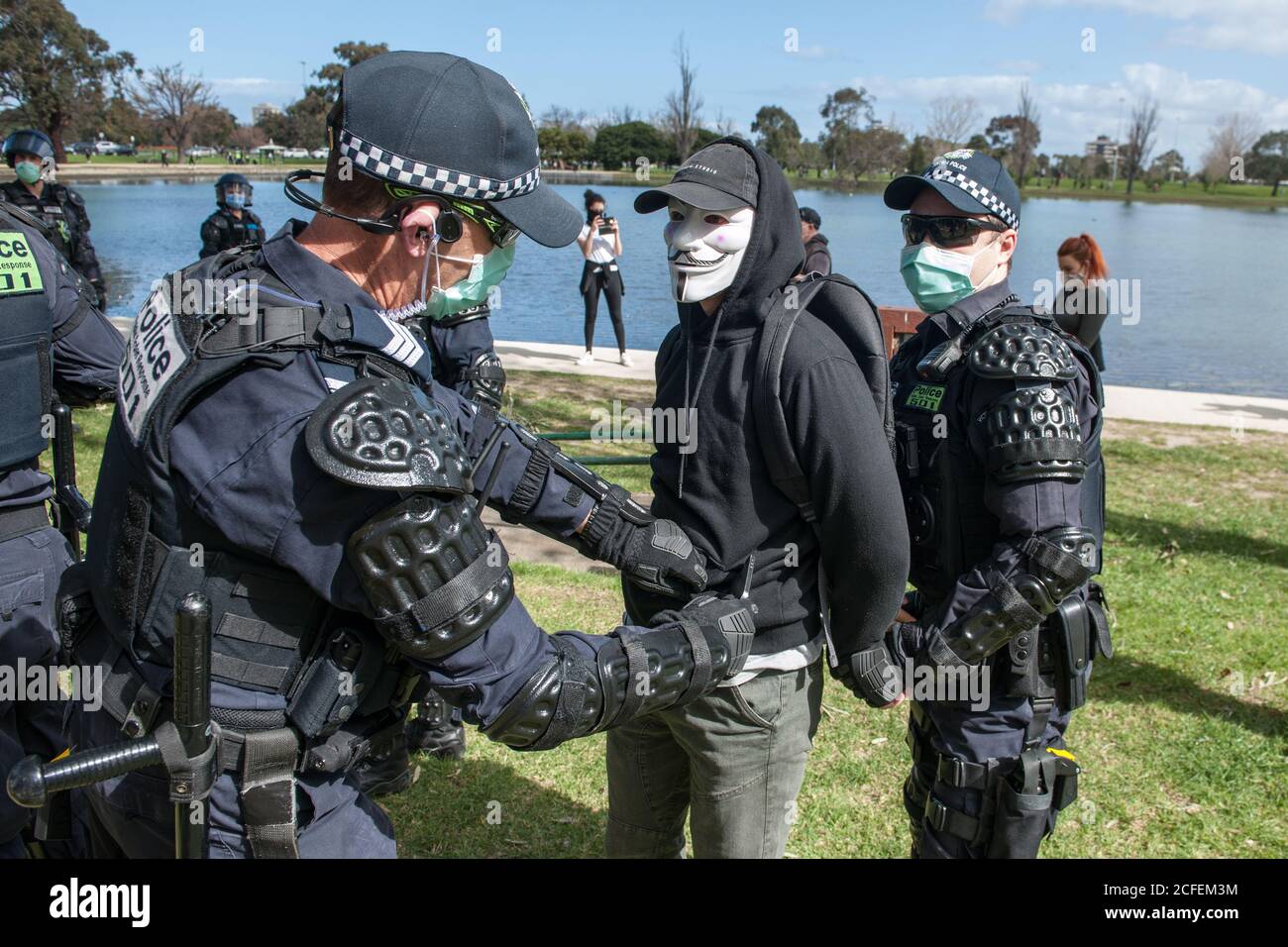 Guy fawkes mask melbourne. Illegal anti lockdown freedom walk protests are spreading across melbourne as unrest grows over. Videos also show a number of men being tackled to the ground by police. Illustrator david lloyd stylised a smiling face with red cheeks a wide moustache upturned at both ends and a thin vertical pointed. Many of the anti lockdown protesters on sunday were spotted wearing guy fawkes masks with flares being.